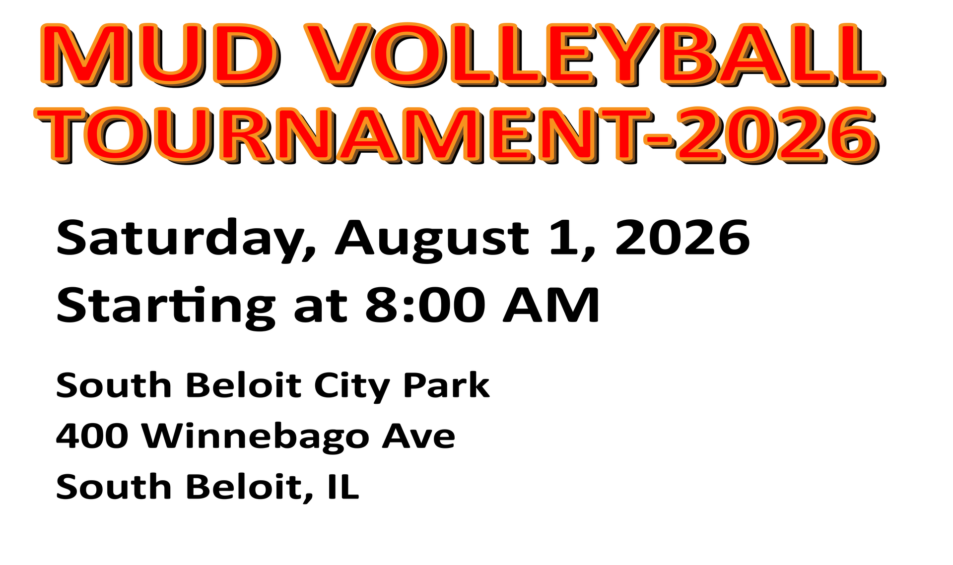 Glass containers are not allowed. IT IS ABSOLUTELY FORBIDDEN TO GO INTO THE LAKE. If anyone attempts to go in, they will be asked to leave the event. Going into the lake may cancel all future Mud Volleyball Tournaments at South Beloit City Park There is no trash to be left on the ground. There is no fighting. No weapons are allowed on the premises.